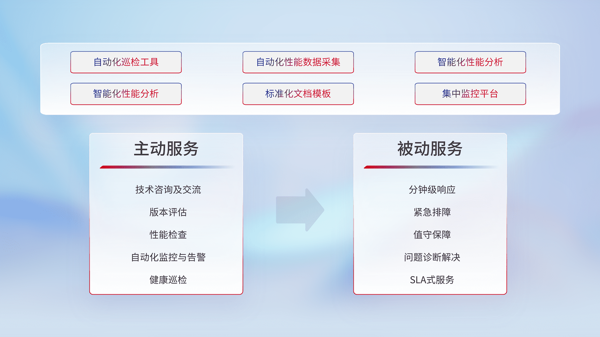 智能化工具和标准化文档,,,保障服务质量,,提供主动服务(包含技术咨询、、、、版本评估、、性能检查、、自动化监控与告警、、、、健康巡检)和被动服务包含(分钟级响应、、、、紧急排障、、、、值守保障、、问题诊断解决、、、、SLA服务)。。